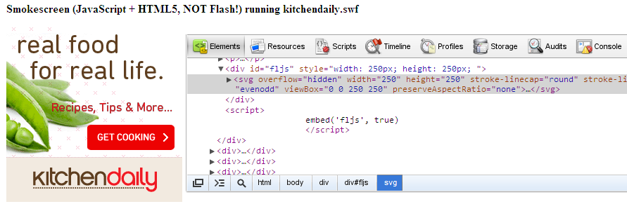 Mittels des Webkit Inspectors kann man erkennen, dass die Flash-Animationen und Grafiken in SVG umgewandelt werden, welches dann in HTML5-kompatiblen Webbrowsern angezeigt werden kann. Ein zusätzliches Plugin wird auf dem Client nicht benötigt.
